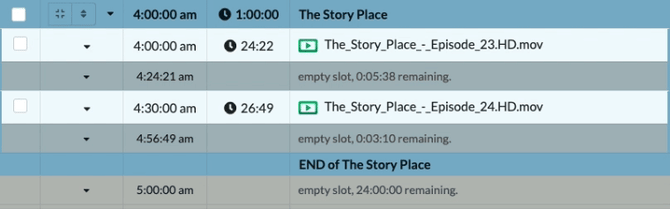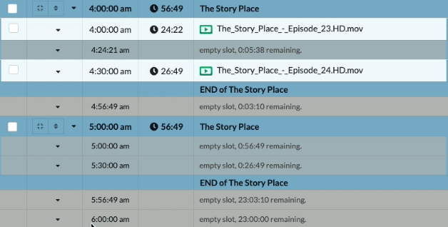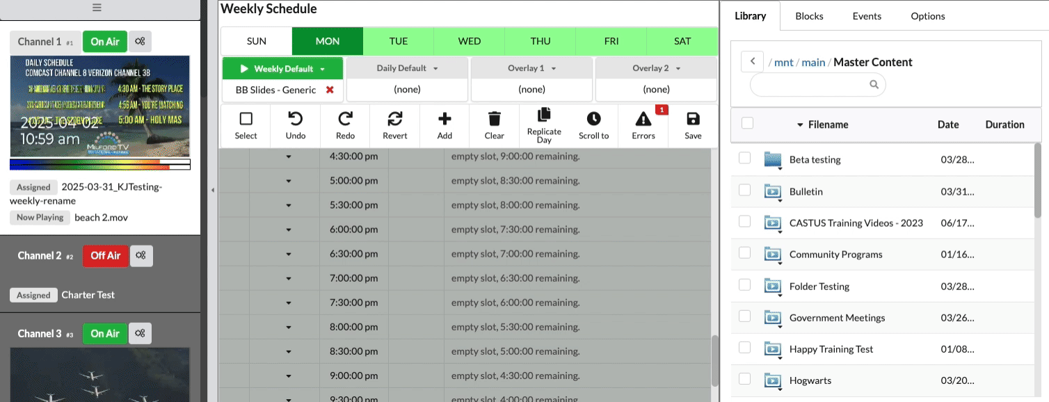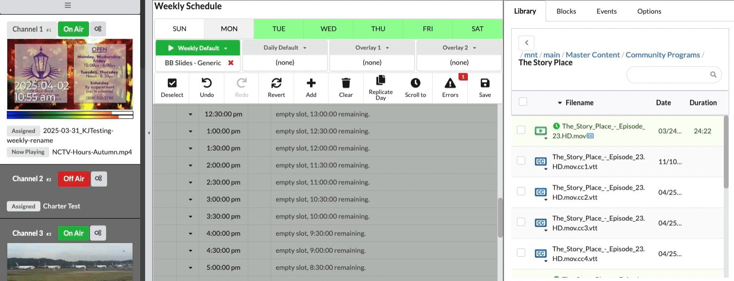 - After creating a blank block in the schedule, utilize the Library widget located on the right side of the screen to browse and select the content you wish to incorporate.