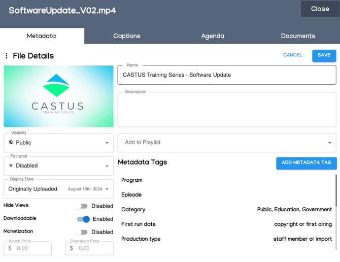 - Metadata can be added to a video as well to assist with searching both on the back end and public page of your cloud portal. Metadata tags are brought over with your video if you’re sending from your QuickRoll or QuickCast, or can be manually added here by selecting Add Metadata Tag.