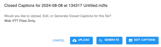 - To generate or upload captions, exit the caption tab and select the caption button for your video in the library. Choose to caption the video or to upload .vtt captions here. If the file was captioned live and has embedded or sidecar captions before sending to VOD, your captions will pass through to VOD and you do not need to generate additional captions.