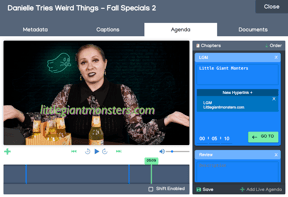 - Use the play button to play your video with audio or click and drag in the timeline to scrub through your video. Choose the plus icon to add an agenda point.