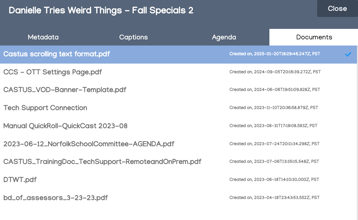 Documents can display alongside your video and on the public page, users can switch between the index and the document for a video. Documents must be PDF format.