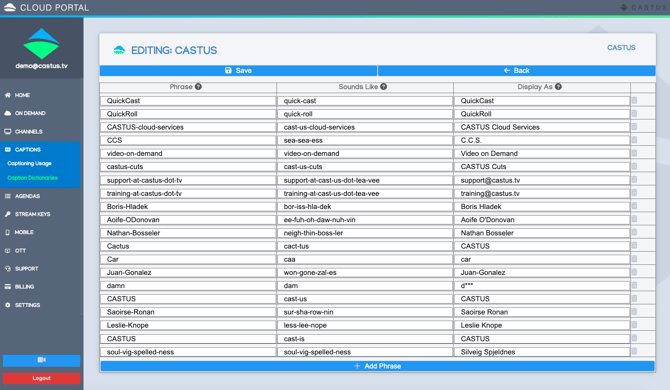 Captioning customers can enhance the already remarkable accuracy of over 97% in their captioning by developing and managing a personalized dictionary within the CASTUS Cloud Portal. This dictionary allows you to provide a phonetic breakdown and display text for challenging names, terms, locations, and acronyms.