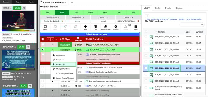 Schedule - To quickly locate the saved location of a scheduled item, simply click the dropdown menu next to the scheduled file name and select locate file. This action will highlight the corresponding file in the library widget, making it easy to find. This feature is also applicable for your default and overlay items.