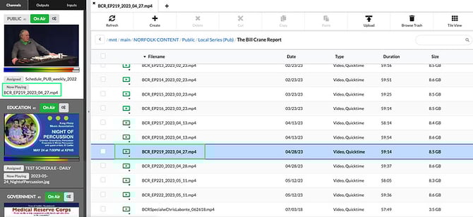 Confidence Monitors - Beneath the confidence monitors on the left side of the user interface, you will find a display of both the assigned content for the channel and the currently playing item. You can click on either name to access the corresponding schedule or to navigate directly to the file's location in the library.