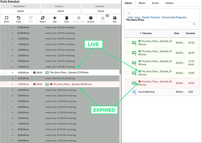 The Go Live and Expiration metadata tags, previously known as Content Window Open and Content Window Close, are essential for keeping your programming current. The Go Live tag specifies the date when a program becomes available for airing, while the Expiration tag indicates when it will no longer be broadcasted on the channel. If a program falls outside of its designated live window, it will not be played in your schedule. Instead, the system will either revert to the default schedule or, in the case of a simple playlist, skip the program entirely.