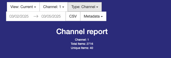 Channel: Displays the current Channel number, the Total Items count indicating how many times all items have been played, and the Unique Items count representing the total number of distinct programs that have aired.