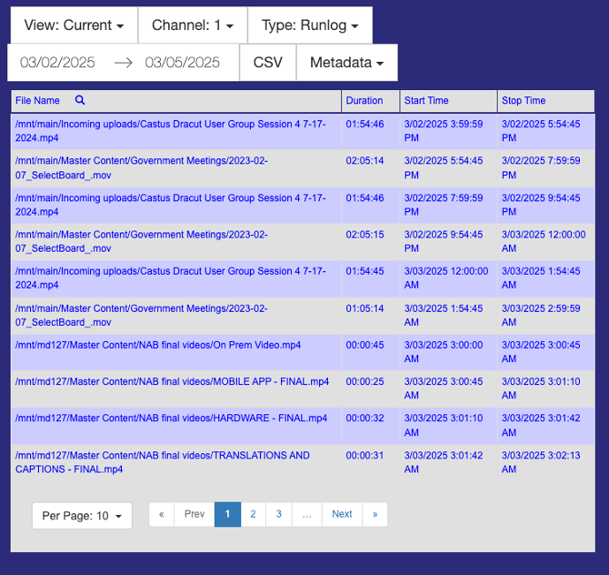 Runlog: Displays the File Name as a file path, along with the Duration of each item, and the Start Time and Stop Time for every instance played.