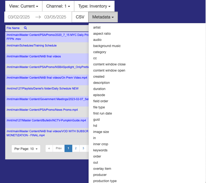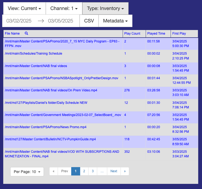 Inventory: Presents the File Name as a file path; Play Count, indicating how many times each item has been played; Played Time, reflecting the total duration that the item has aired; and First Play, which marks the initial date and time the item was broadcast on the channel.