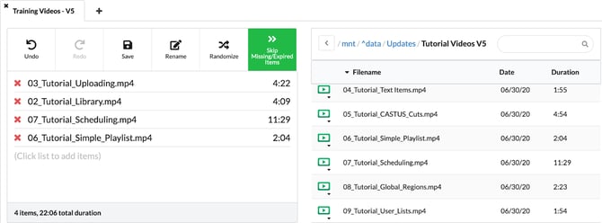 Skip Missing or Expired Items: Automatically skip media no longer in the library or past their metadata expiration date. Green = On, White = Off.